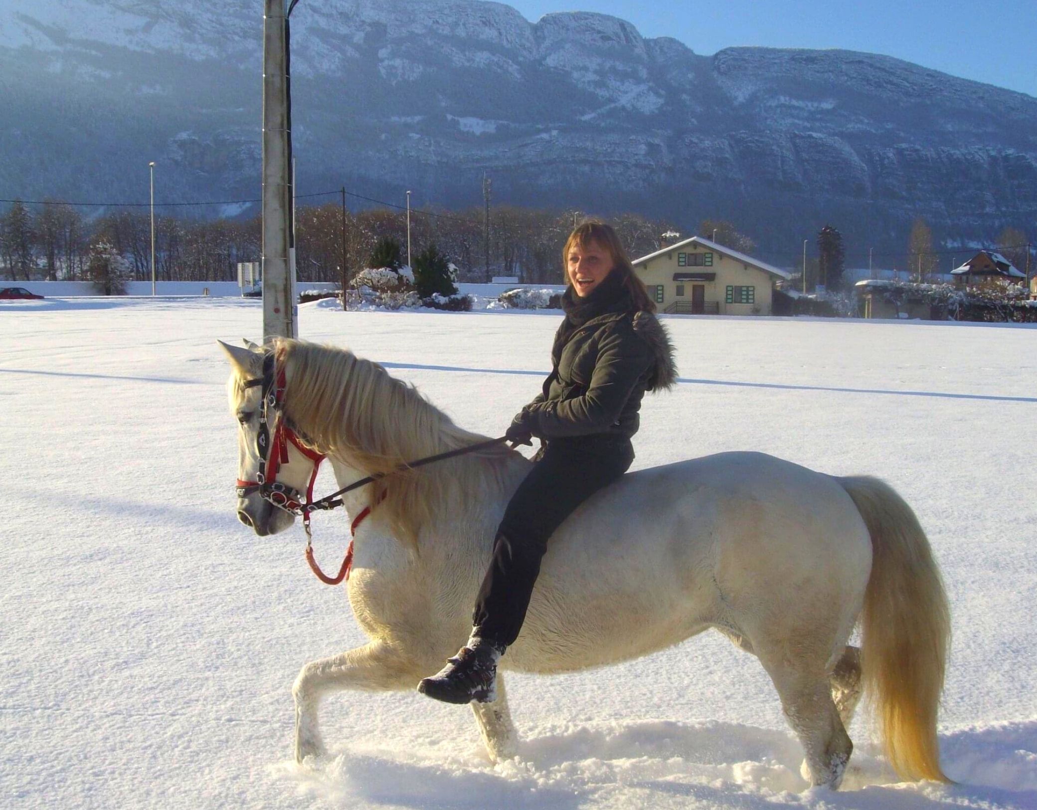 - Balade hivernale à cheval Écuries de Chevaline cavalière et cheval dans la neige Crédit photo : Écuries de Chevaline