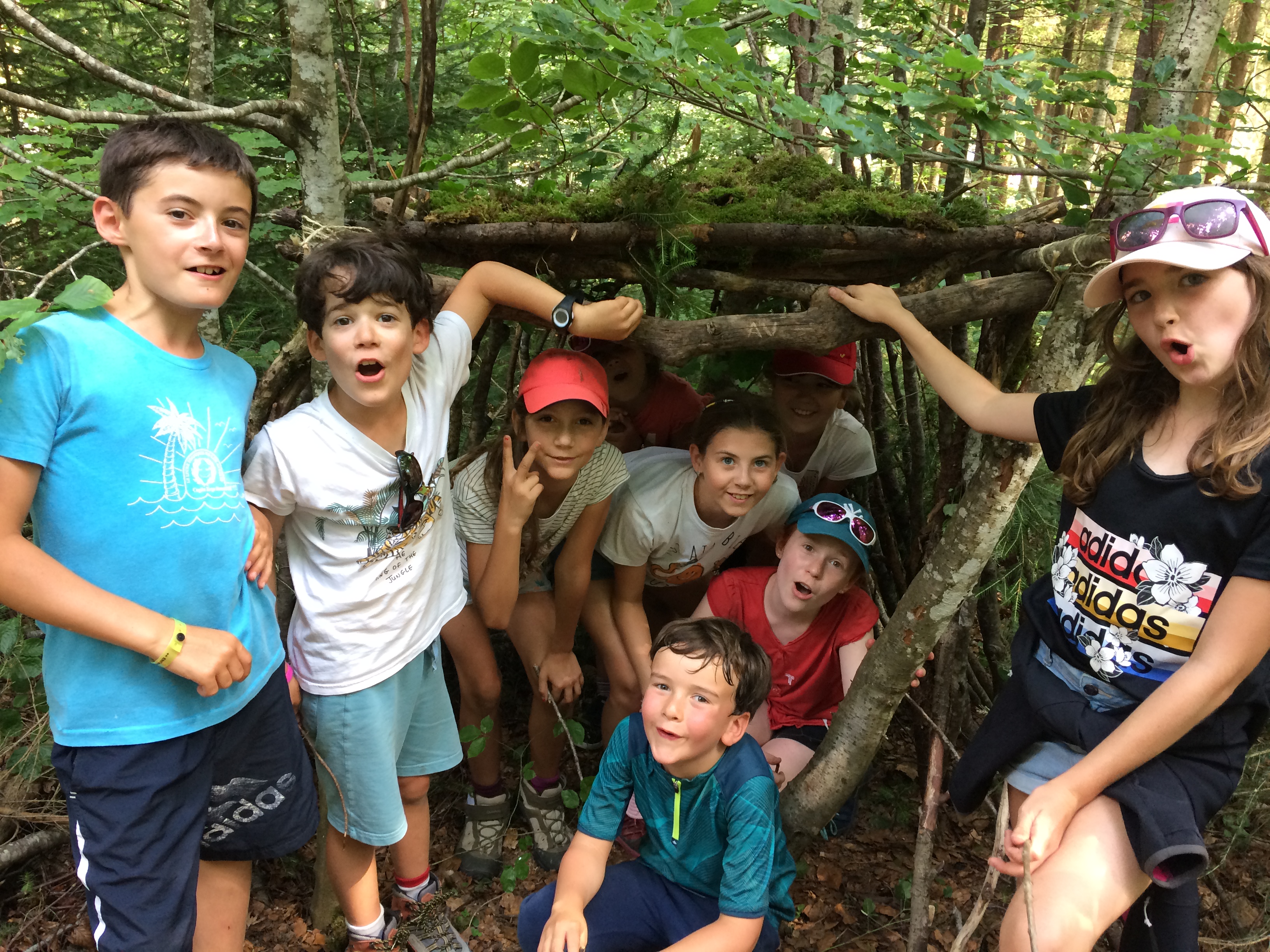 - cabanes et chamallow groupe d'enfants souriants dans une cabane faite de branchage Crédit photo : Alicia - AEM