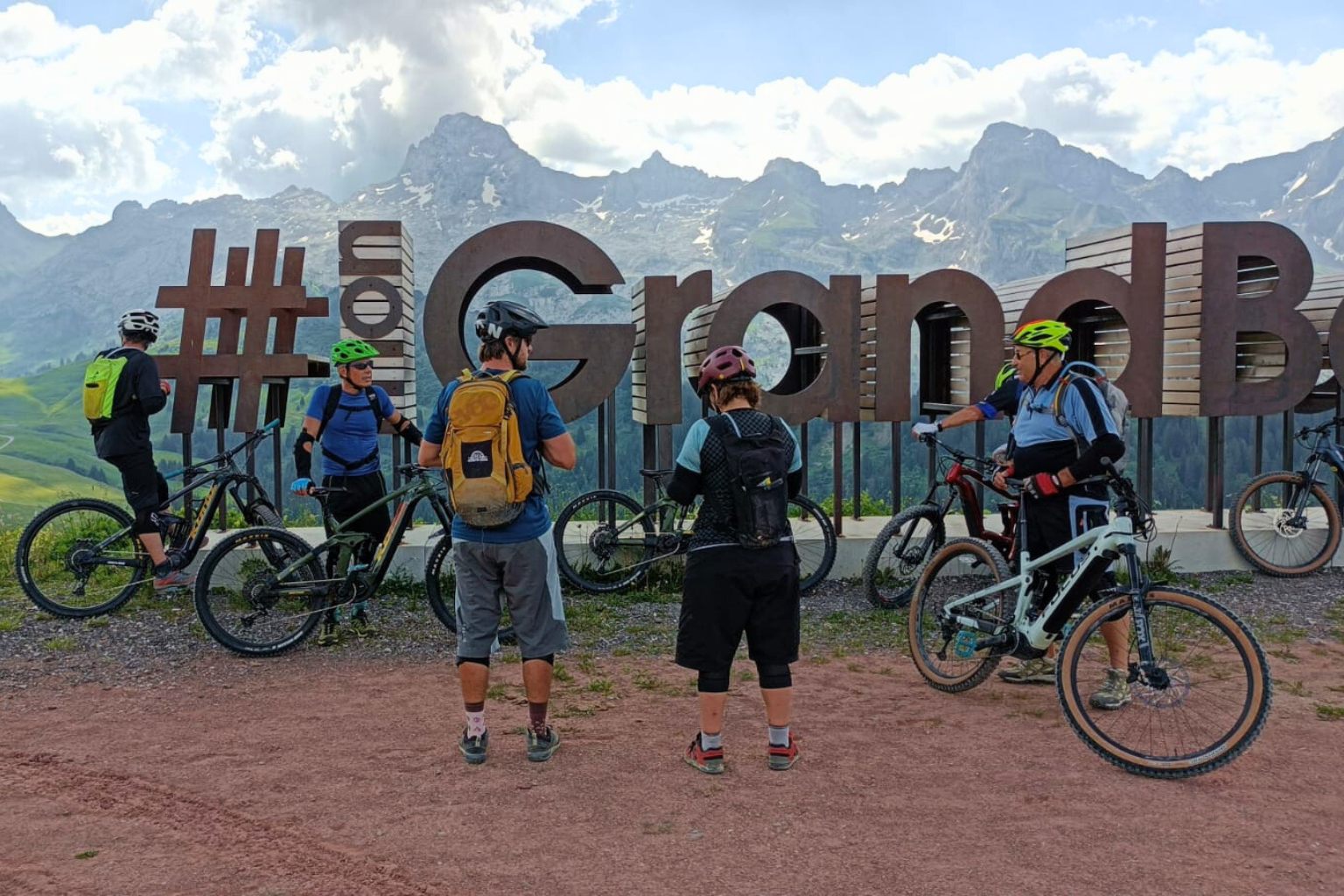 - Séjour VTT électrique en itinérance des Aravis à l'espace Diamant_Le Grand-Bornand groupe de VTTistes devant le hashtag mon grand-bo Crédit photo : Arav'e-Bike