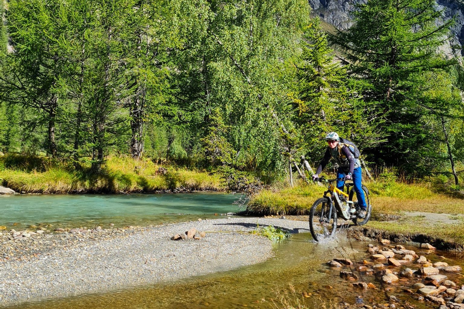 - Séjour VTT électrique en itinérance des Aravis à l'espace Diamant_Le Grand-Bornand un VTTiste traversant une rivière Crédit photo : Arav'e-Bike