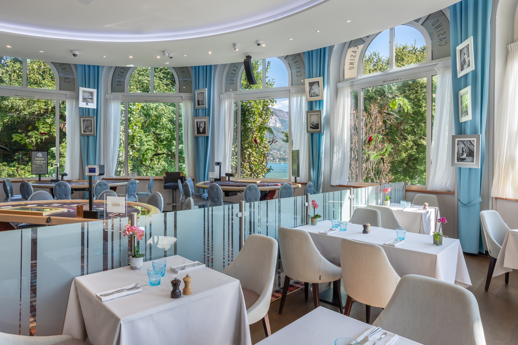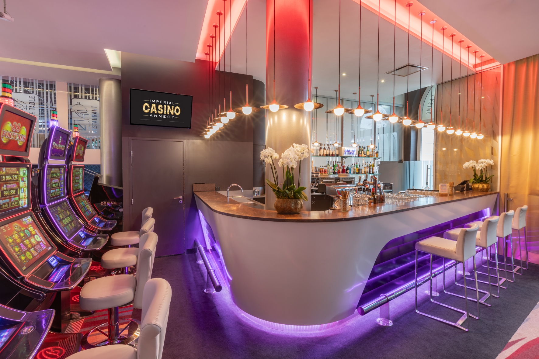 Simplement envie de prendre un cocktail après une sortie sur Annecy ? Profitez du bar situé sur l’estrade dominant la salle des machines à sous pour contempler les lumières et vous imprégner de l’ambiance trépidante du lieu !
