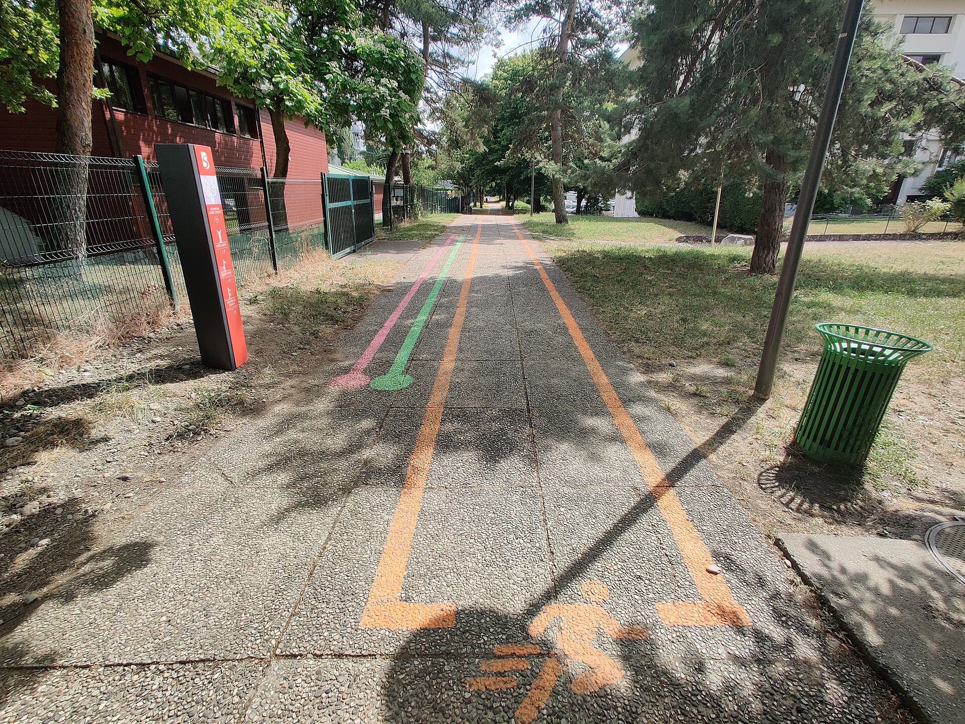 Ce parcours traverse le Parc de Valeury jusqu'au bord de l'Arve et offre un paysage varié entre espaces urbains et naturels. Des agrès sportifs jalonnent le parcours pour des exercices complémentaires, tandis que des panneaux d'informations dispensent conseils d'échauffement et consignes de sécurité.