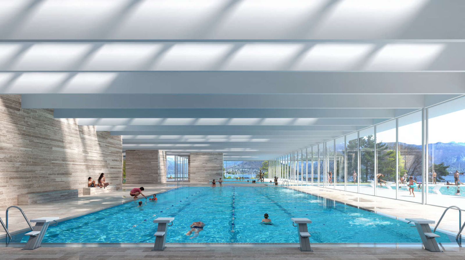 La piscine des Marquisats bénéficie d'un emplacement exceptionnel entre lac et montagnes et dispose de nombreux aménagements en plein air. - 1 bassin sportif (50m x 21m) avec 8 lignes d'eau chauffées