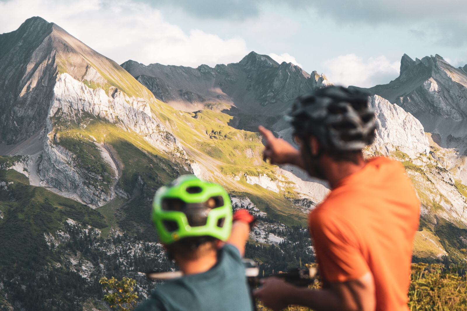 - Domaine VTT du Grand-Bornand VTTiste et son fils contemplant la chaîne des Aravis Crédit photo : P.Guilbaud