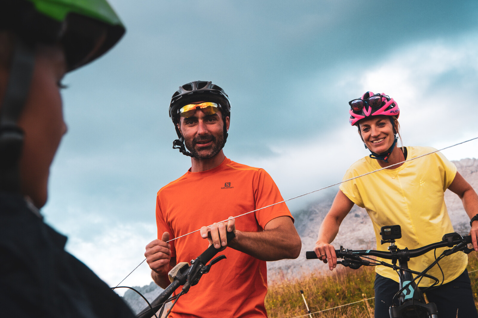 - Domaine VTT du Grand-Bornand VTTistes contemplatifs face à la chaîne des Aravis Crédit photo : P.Guilbaud