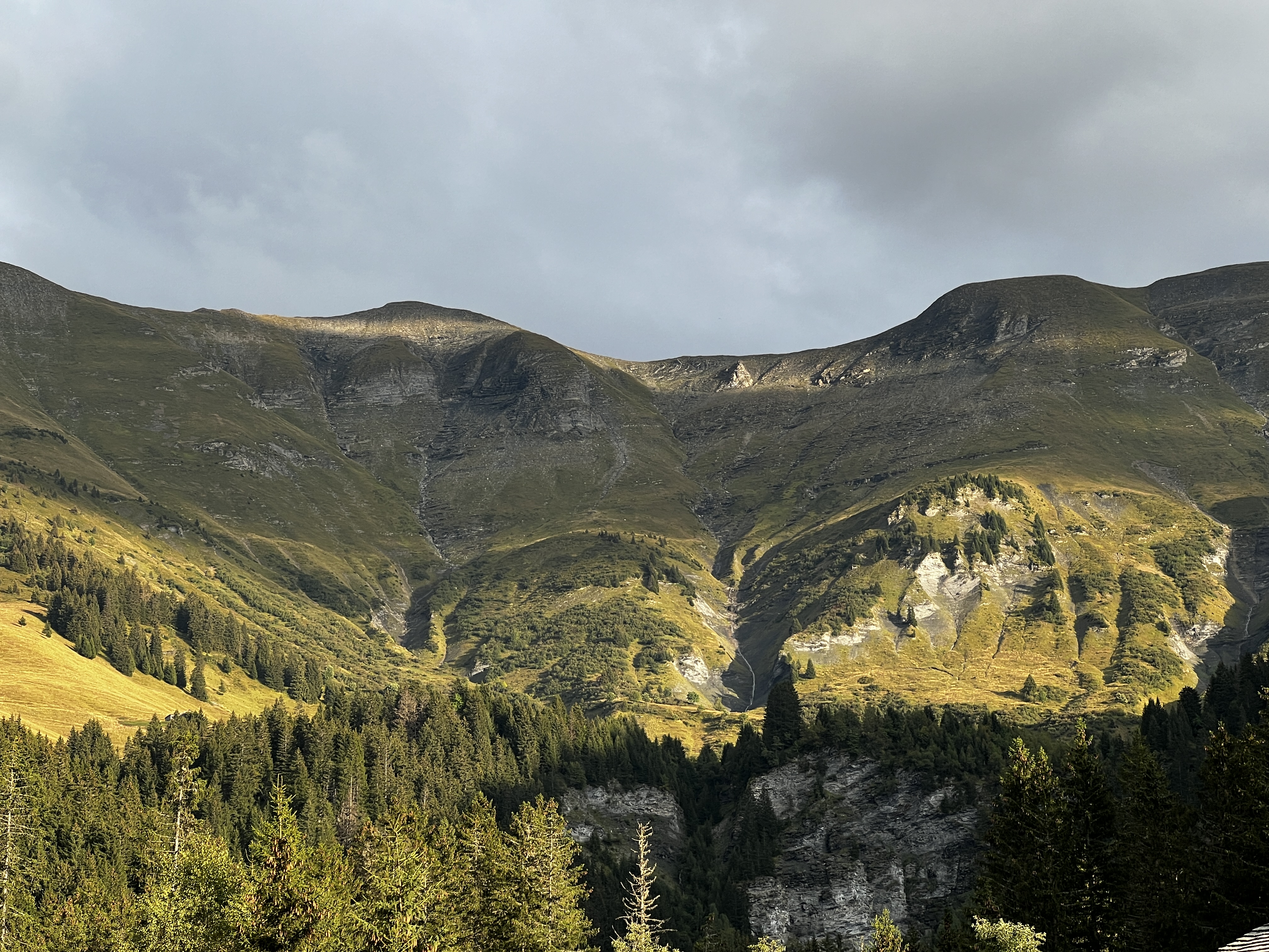 Jolie promenade à travers alpages et prairies, vue panoramique sur le golf. Point de vue exceptionnel sur le Val d’Arly et le village de Megève.