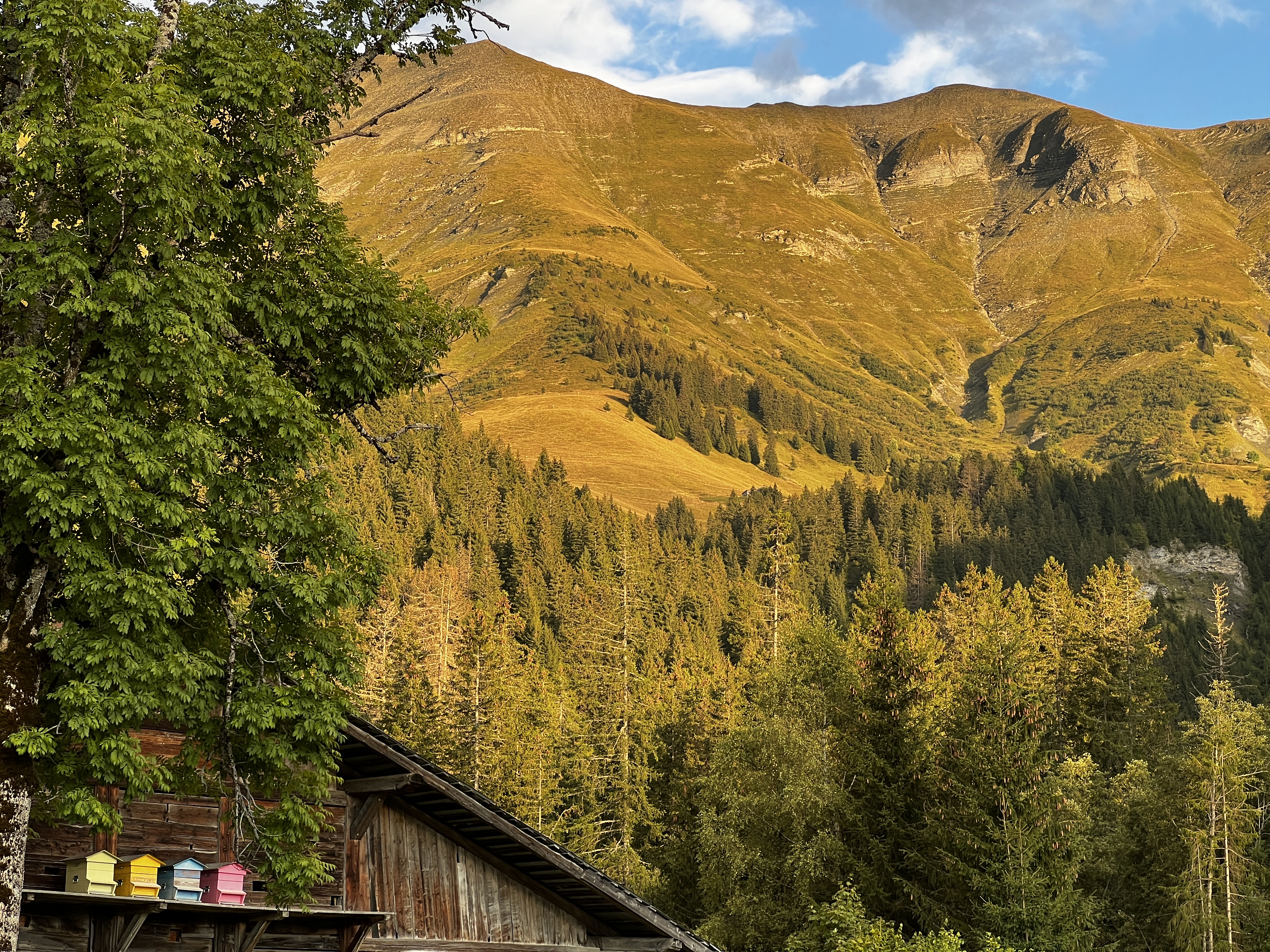 Sur le chemin, admirez une des dernières fermes au milieu de fleurs d’alpages, gentianes, primevères officinales, renoncules etc... et la vue panoramique sur le golf. Vue imprenable sur le massif du Mont Blanc. Table d'orientation au Mont Joux.