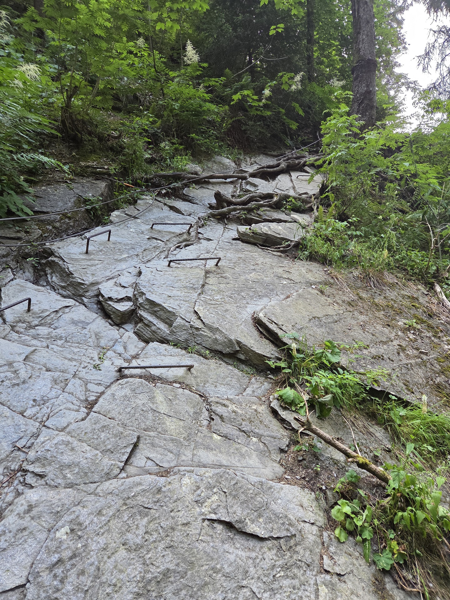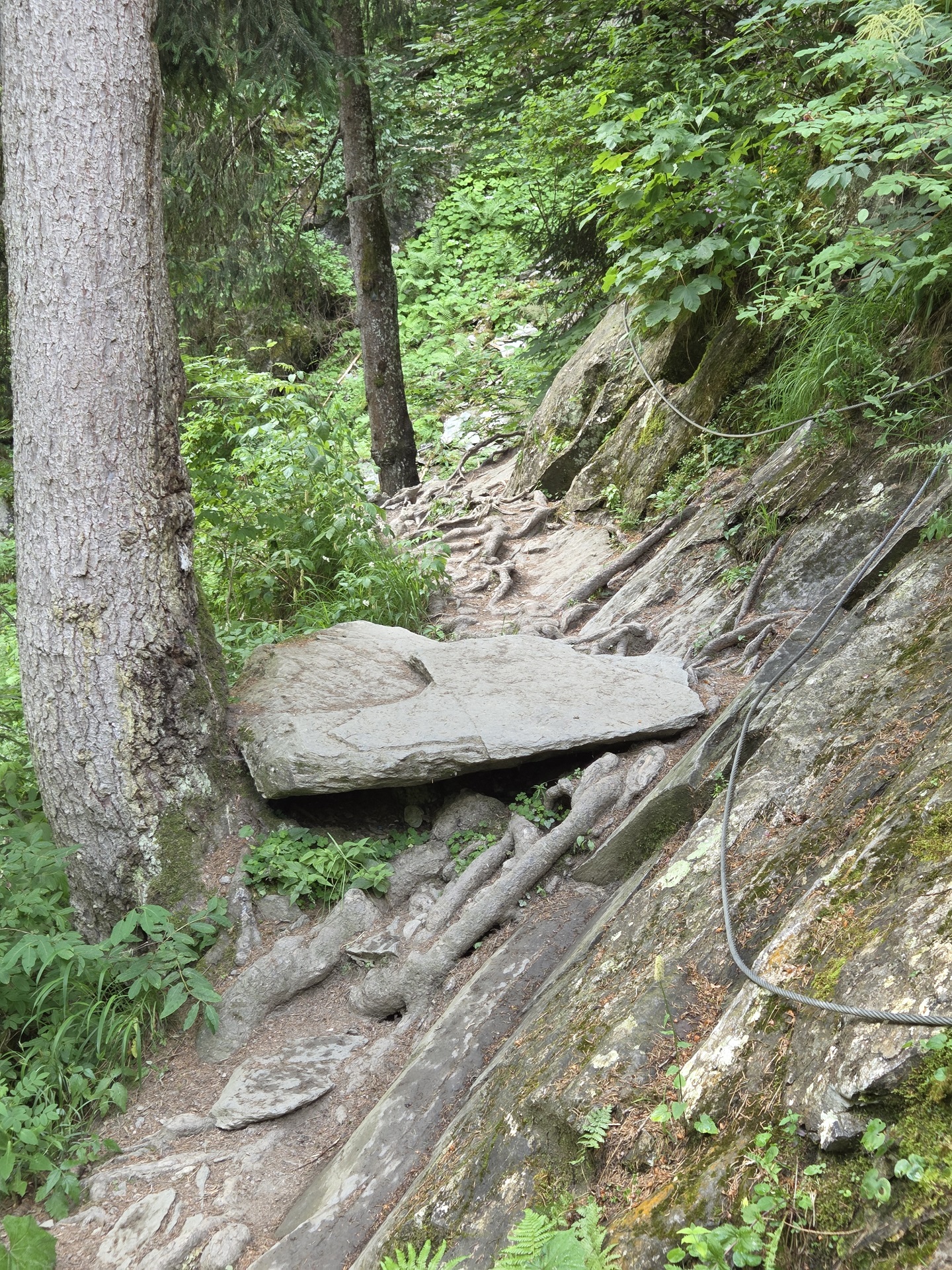 Sentier délicat, boisée, à l'arrivée du bassin : main courante avec de petites marches posées sur des roches lisses et glissantes.