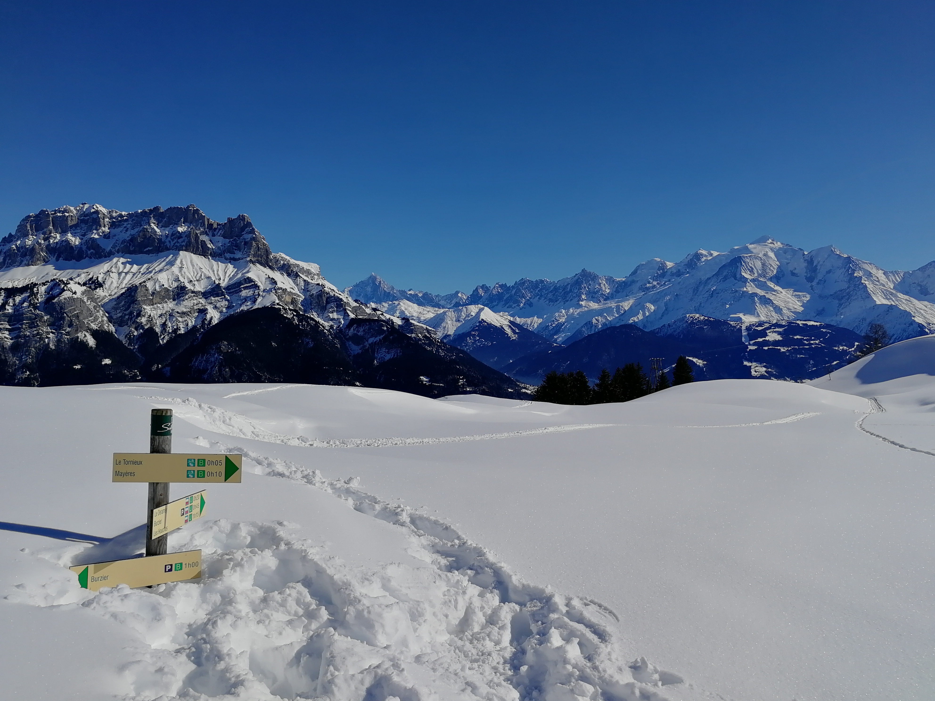 - sentier raquettes : boucle du plateau de Mayères vue sur les Fiz et le Mont-Blanc Crédit photo : Emilie Perrin