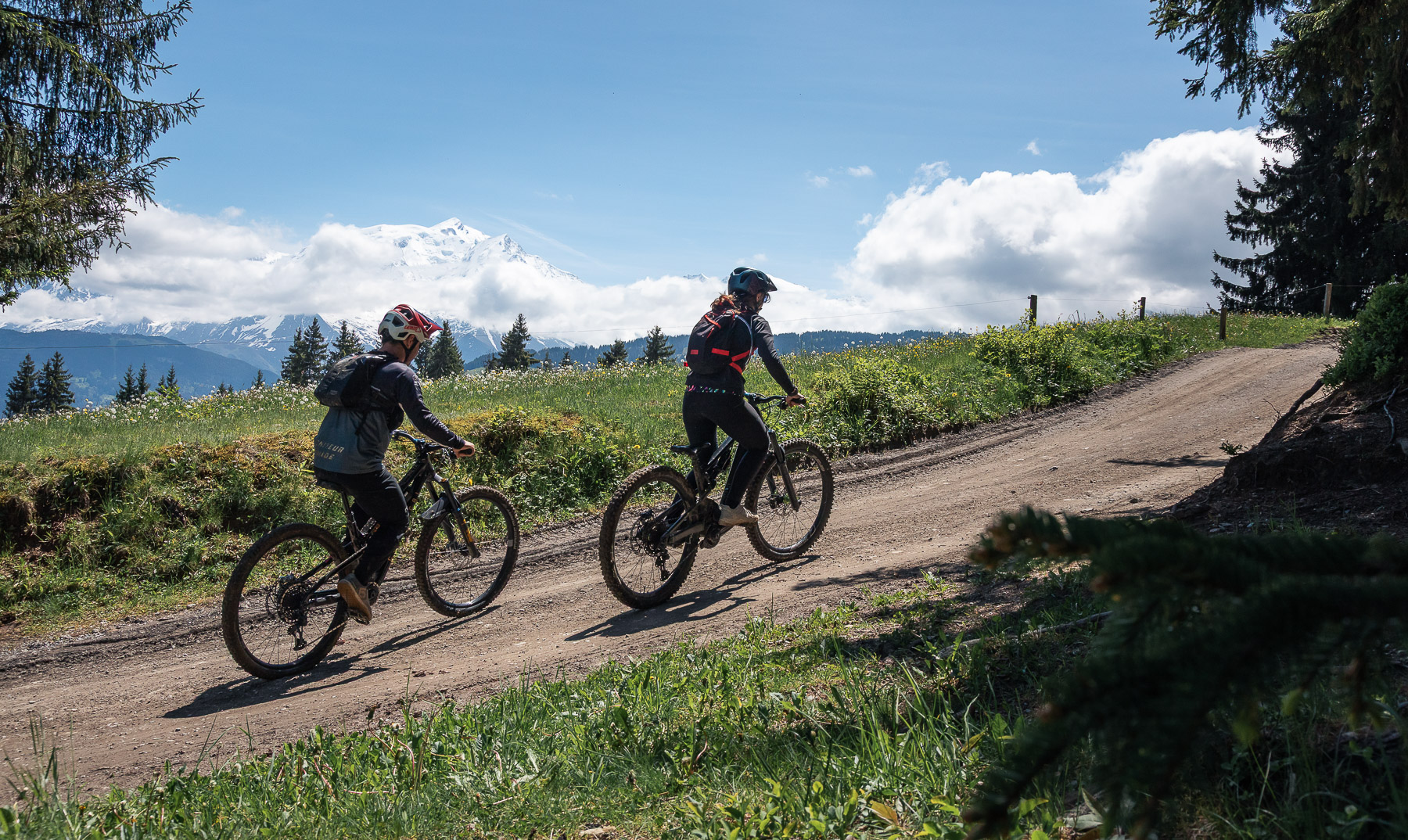 - VTT Mont-Blanc couple en VTT sur sentier face au Mont-Blanc Crédit photo : OT Combloux_Marine Martin
