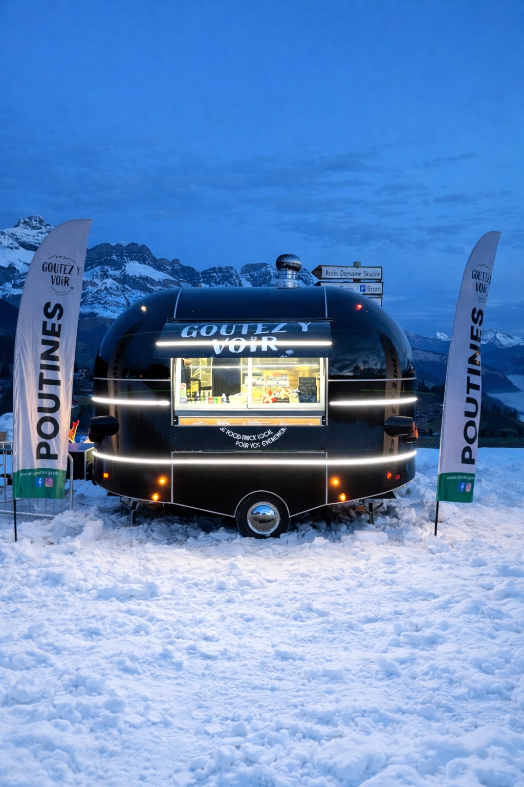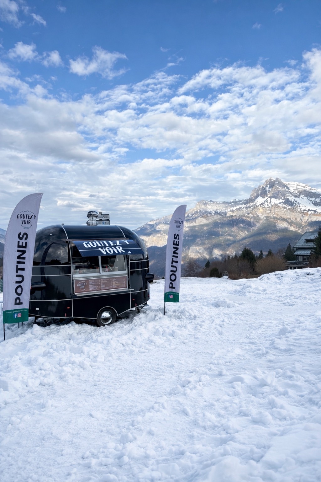 Food truck revisitant la poutine façon savoyarde, avec option végétarienne aux marrons. Tenders, gaufres, boissons chaudes et bières du Mont-Blanc. Terrasse de 50 places et ambiance musicale Disco House.