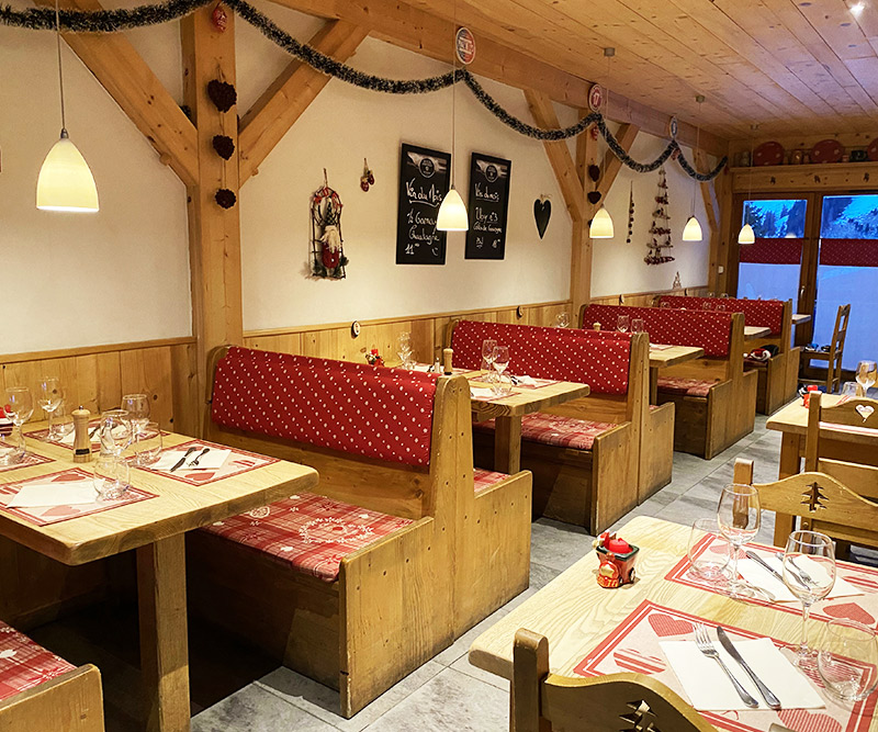 L'intérieur du restaurant arbore fièrement des éléments traditionnels de montagne, créant ainsi une ambiance conviviale et apaisante. Vous serez transporté dans un cocon haut-savoyard.