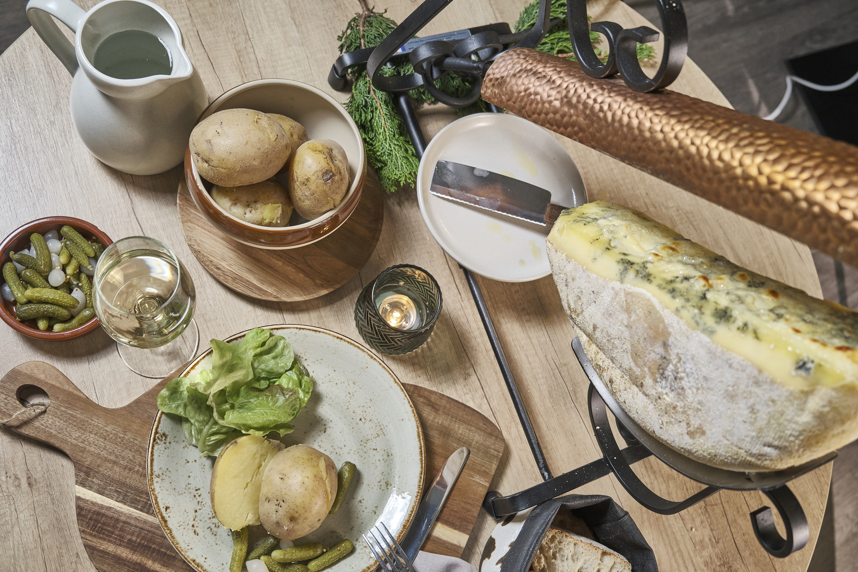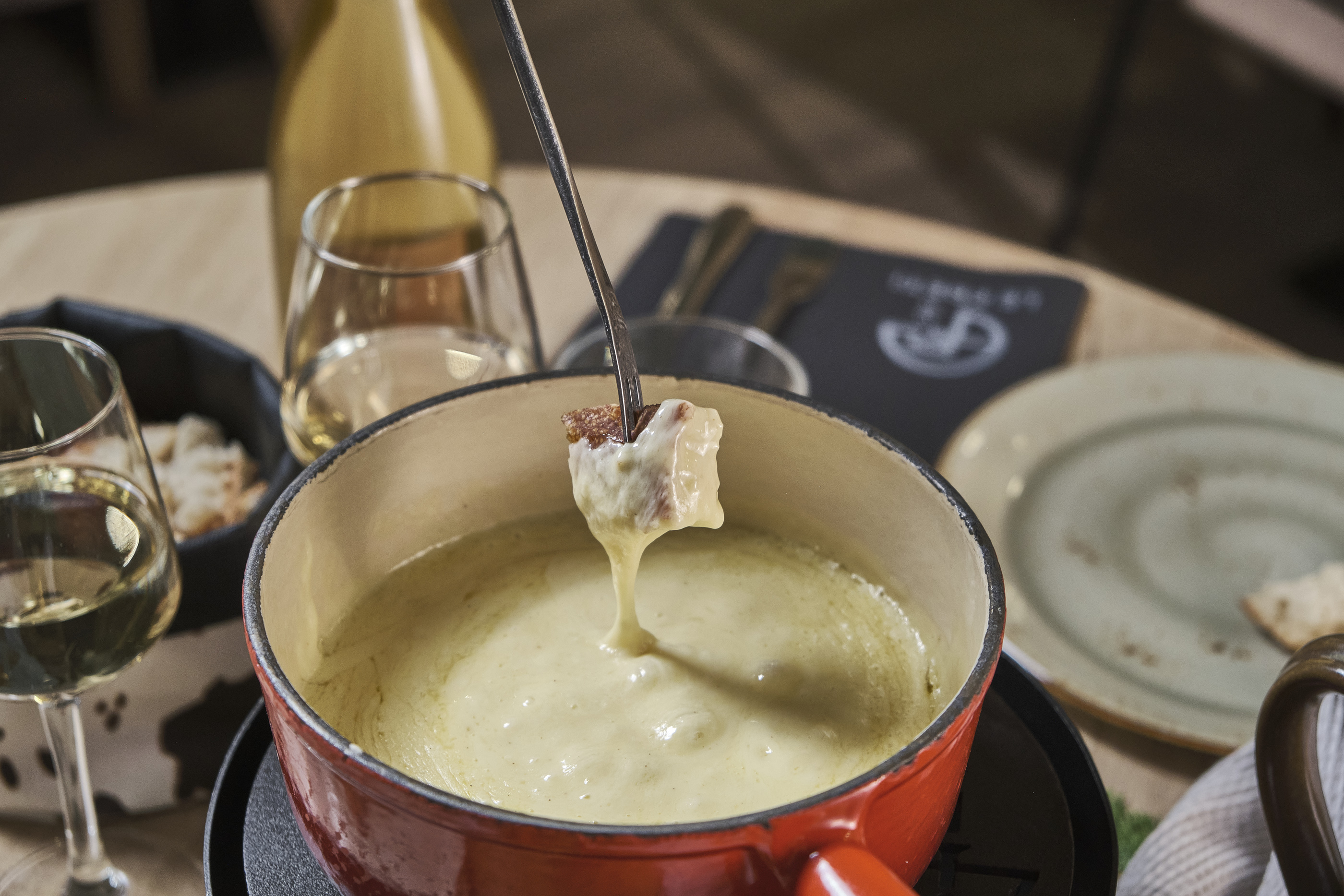 Fondues, raclettes, plats fromagers, dégustation de fromages affinés.