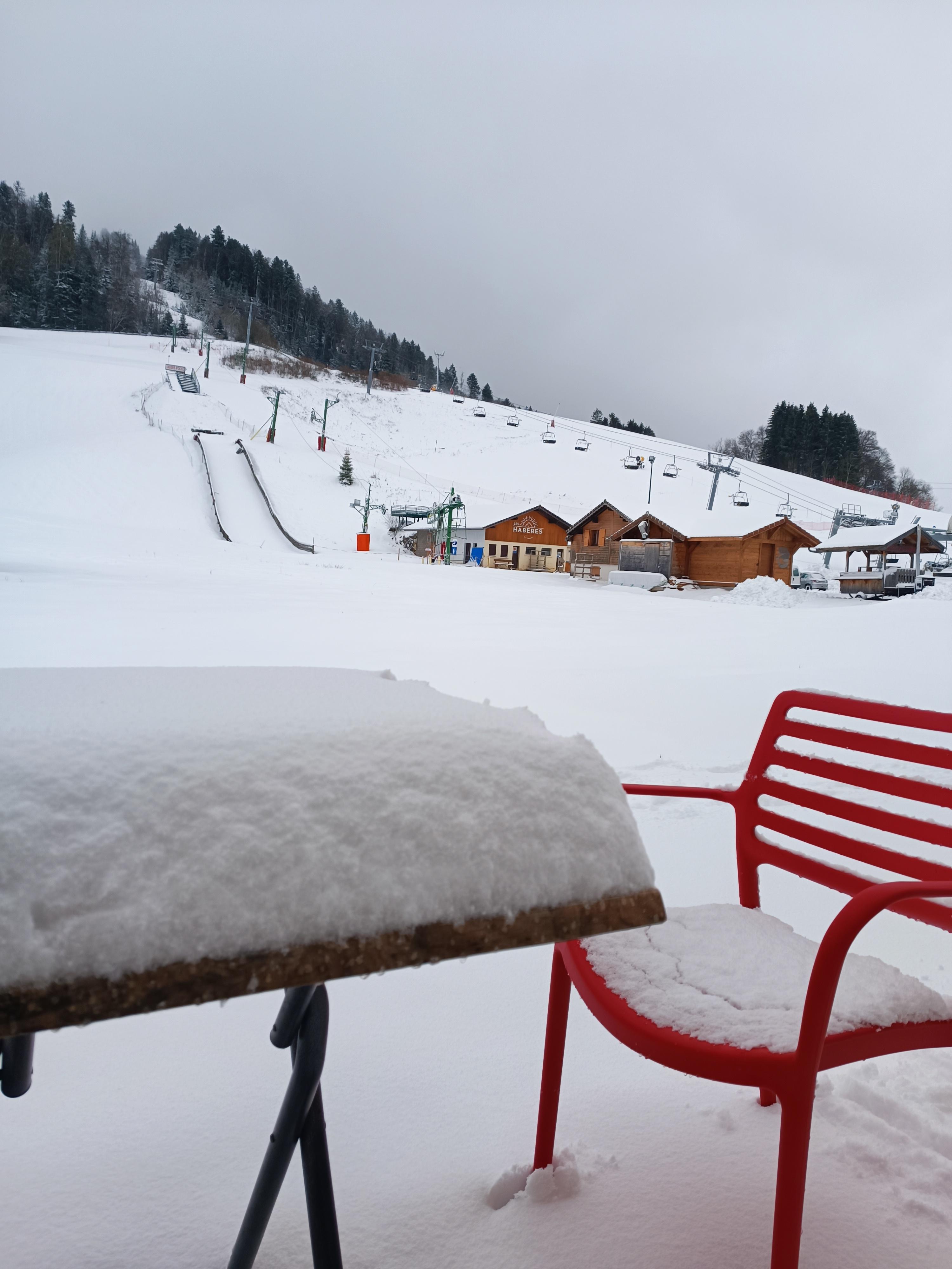 - Auberge du Bois Noir déco siège de télésiège sur terrasse en hiver Crédit photo : Auberge du Bois Noir