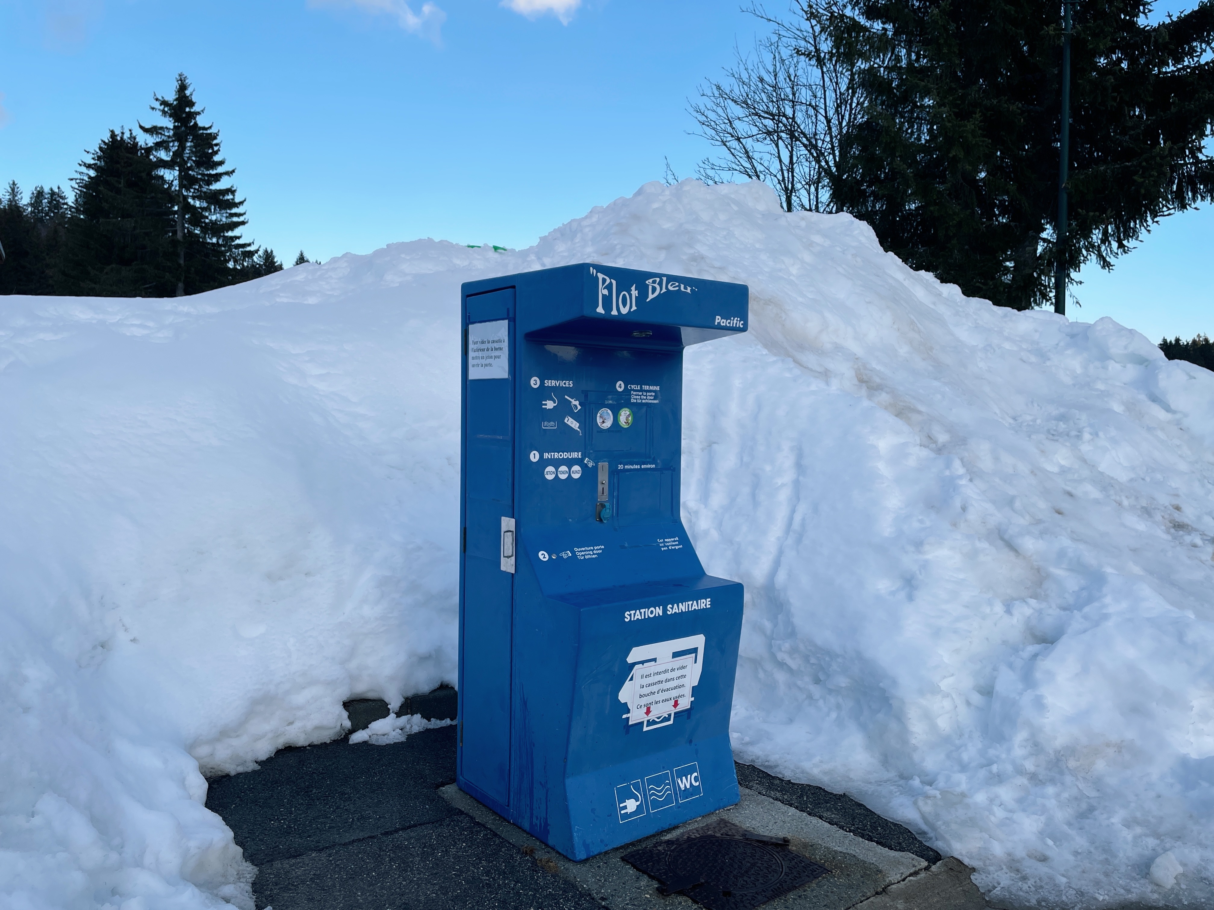Accès à la borne Flot Bleu par jetons: 2 € le jeton (20 minutes) pour l’assainissement, la recharge en eau, la vidange et l’électricité.