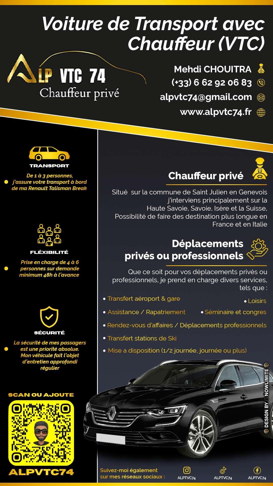 ALPVTC74 vous propose ses services de Voiture de Transport avec Chauffeur (VTC) pour tous vos déplacements professionnels et privés.